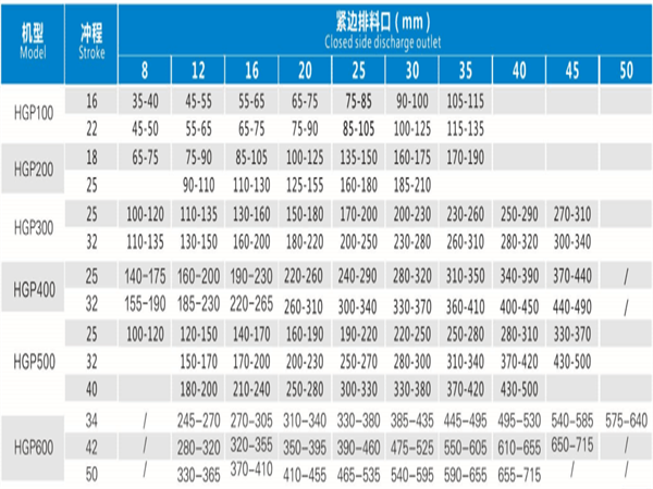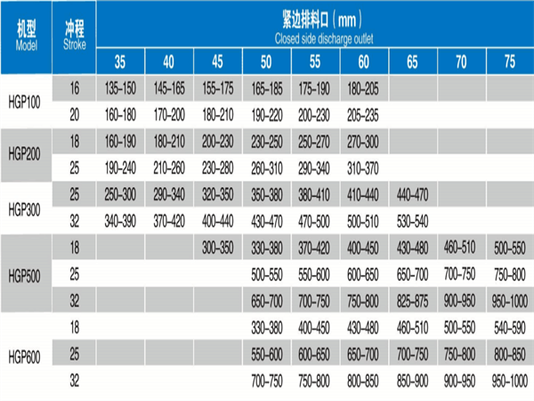 不同腔形、衝程,適用的排料口範圍不同,從主參數表中找出允許排料口大小並與生產能力的參考結合,最大排料會在破碎壁和軋臼壁磨損後變大。