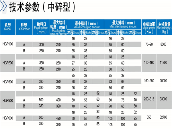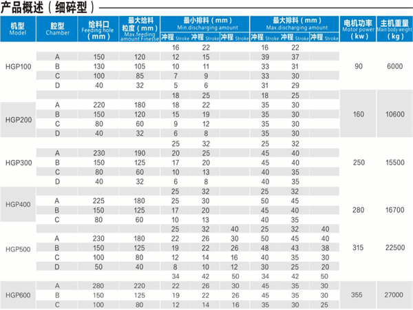表格中生產能力和篩分曲線僅用作參考,隻適用於容重為1.6t/m3的中硬度花崗岩類石料在擠滿破碎腔時的參數,其它物料的參考產量可近似通過容量換算求得。